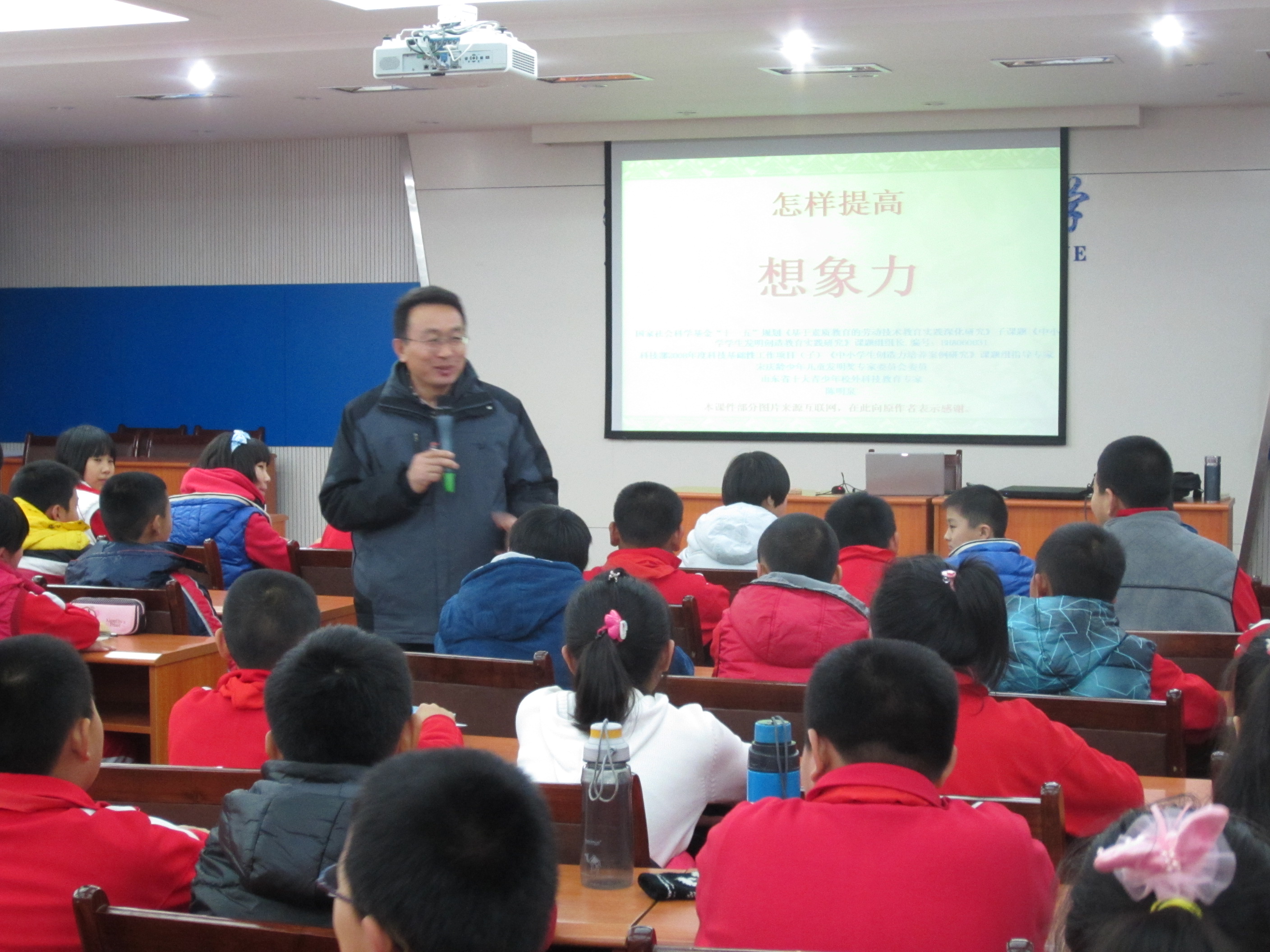 在授课中,陈教授通过大量的图片实例,激发了学生创新的思维与想象的空间。他投身于学生中间,与学生亲密的语言交流,对学生的创意积极地启发与表扬。学生的积极性被完全调动起来,纷纷高举着手,争着要表达自己的创意。整个会场学生创新的思维达到了高潮,想象的空间越来越宽广,敢于想象、乐于想象的意识在孩子们的心田慢慢地生根发芽。