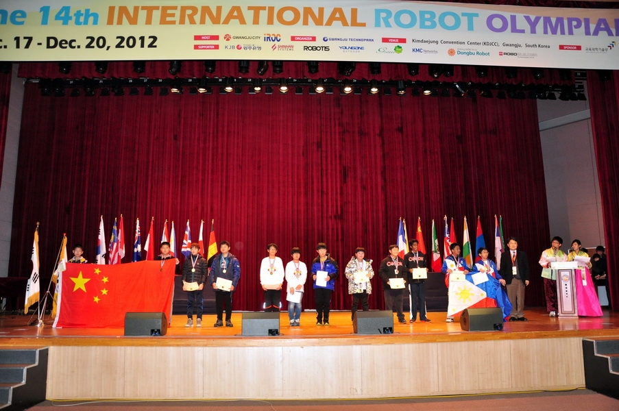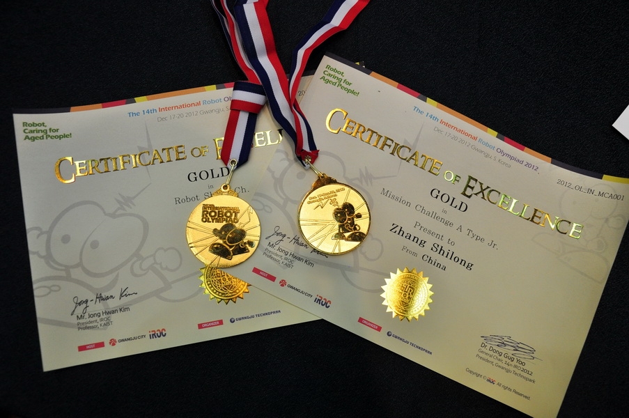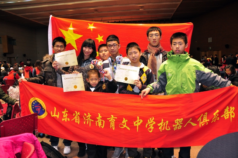 中国代表团本次竞赛派出选手90人,是人数仅次于东道主韩国队的团队,共获2金1银5铜的好成绩。赛前我市育文中学机器人俱乐部7名选手再次受到中国代表团邀请成为组队成员参赛,比赛中育文中学机器人俱乐部包揽了中国代表团所获2枚金牌,为我市争得了荣誉。其中,为中国队夺取挑战赛金牌的张世龙、刘振宇来自育文中学七年级,夺取中国队首金的王锐、王子一来自济南中学高二年级,获得障碍赛第四名的魏齐、庄皓来自山东省实验中学高中一年级。