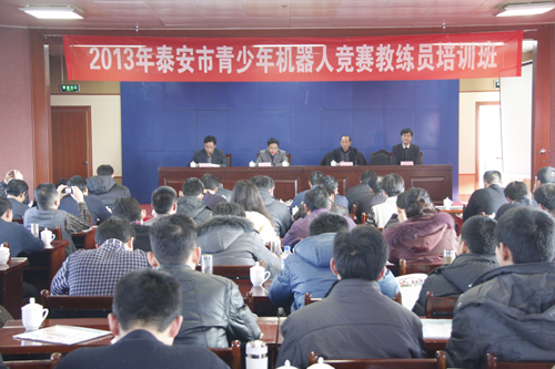 2013年1月12日-13日,泰安市教育局基教科、泰安市科技馆在泰安市东都宾馆5楼会议室联合举办了2013年泰安市青少年机器人竞赛教练员培训班。山东省青少年科技活动中心副主任杨冠楠、山东省青少年科技活动中心活动部部长于翔、泰安市教育局基教科科长徐振涛、副科长张强、泰安市科技馆馆长楚远远出席此次培训班开班仪式。市直及县市区共有75所学校、108名科技辅导员参加了此次培训。