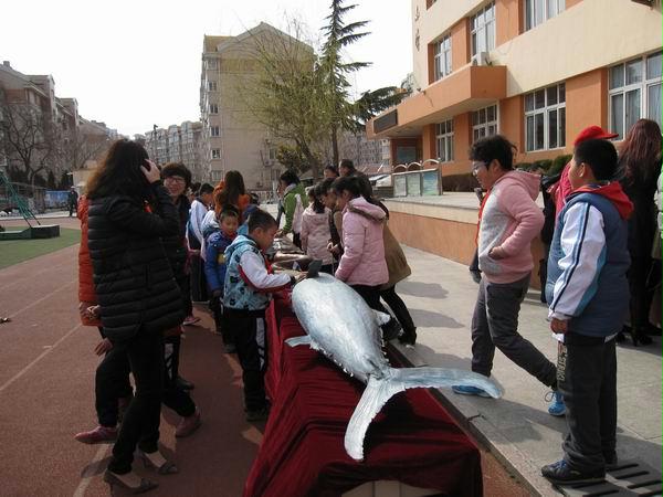 在北山二小活动现场,孩子们一边惊奇地对着眼前的海洋生物标本这看看那看看,忍不住还用手偷偷的摸一下,一边用自己现有的知识讨论着和这些神奇的海洋生物有关的话题。过了一会,志愿者讲解员阿姨开始对着海洋标本给小朋友们讲解了。在企鹅标本前,讲解员问:“你们知道企鹅最高能有多高吗?你们知道哪种动物的爸爸是最称职的吗?”小朋友们都开始摇头了。讲解员阿姨告诉大家:“企鹅最高的能有1.5米,小朋友们想想自己现在有多高就能记住了,还有啊,企鹅爸爸是世界上最称职的爸爸,他们会三个月不吃不喝一心孵化自己的企鹅宝宝。”讲解员的生动讲解使小朋友们深深地沉浸在了神奇的海洋世界里。