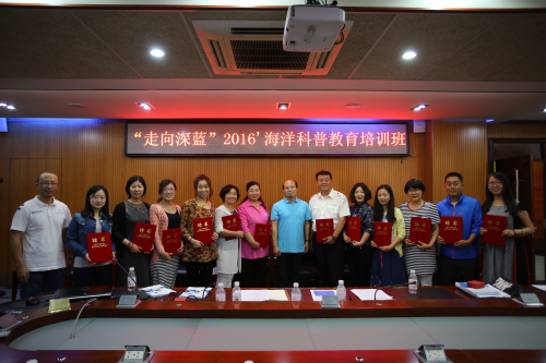 国家海洋局第一海洋研究所、中国大洋样品馆组织专业科技力量编写了《“走向深蓝”海洋科普教育计划——深海资源探秘》科技教师专业培训用书,并赠送给部分海洋特色学校。此次培训由数位海洋专业的博士、研究员所组成的专业团队亲自授课,讲授关于国际海底与我国国际海底资源调查、国际海底资源勘查开发技术、海底矿产资源等方面的专业知识,并分期分批对全市中小学科技教师进行专业系统的“深海资源”培训,为经过培训、考察合格的教师颁发证书及中国大洋样品馆客座讲师聘书。