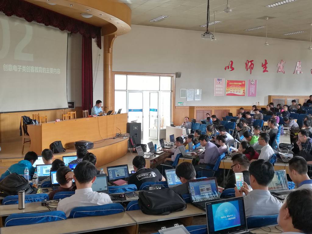 整个培训活动过程中,傅老师紧紧围绕创客教育的理念与实践、Arduino简介及套件选择、米思齐程序设计初步、交互灯、入侵检测、可调灯、智能灯、创意门铃、噪音计、遥控灯、创意电子琴、超声波测距仪、公园人数计数等为来自各全市100多名教师进行讲解培训。通过培训,老师们深刻了解到创客教育的重要意义,并愿意在今后的教育教学过程中将当前的互联网技术结合起来,立足解决现实问题,在合作探究和问题解决过程中鼓励学生探究和创造。鼓励孩子们将自己的创意和想法变成作品,拓展他们的思维,培养他们的创造能力,让他们在这个过程中感受到成就感和快乐,形成独立思考和创新的精神。
