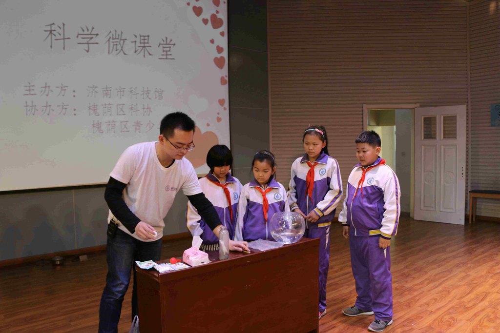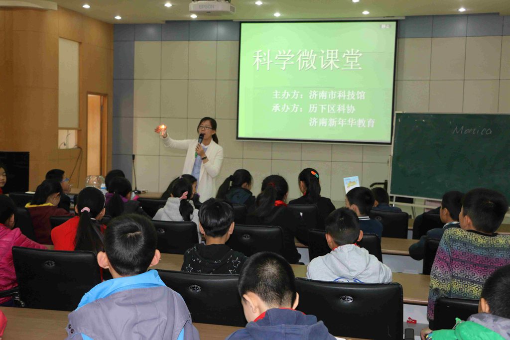 “科学微课堂”是由济南市科技馆和济南科学传播协会发起,邀请相关教育培训机构的老师授课的公益活动。他们运用科学实验、科普知识问答等方式将枯燥严谨的科学知识和原理趣味化,使学生由“要我学”变为“我要学”,在轻松欢乐的氛围中学习知识,深受学生们喜欢,这种教学模式遵从学生的学习规律,有意识地培养学生的兴趣,在寓教于乐的形式中激发学生的潜能,从而有效地提高学生的创新能力和实践能力。