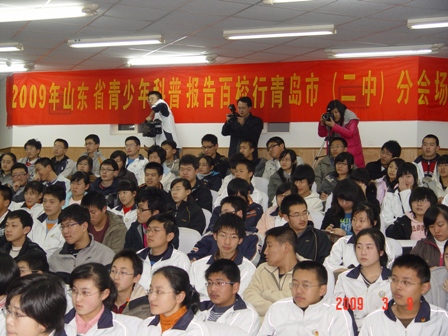 由中国科学院14位老科学家组成的2009年山东省青少年科普报告团,于3月1日—14日在省内17市100余所学校开展。报告内容涉及航天、防震减灾、遗传基因、生物多样性、神奇的南北极、神州七号载人航天、国防等内容。3月9日,中科院的老科学家们来到青岛。青岛市科技馆邀请老专家们来到了青岛二中、青岛五十八中、青岛十九中、青岛大学附属中学、青岛市北区少年宫、四方区鞍山二路小学作了精彩的报告。徐邦年、潘厚任、徐德诗、潘习哲、何香涛和陈贺能6位专家分别就未来空战与航空武器的发展、太空人的衣食住行、防震减灾、卫星遥感、天文和物理科学知识等主题,针对青少年的求知欲强、知识面要求较宽、接受新事物快、兴趣广泛的特点,将一些高深的专业知识与科学性、知识性、趣味性相结合,用通俗易懂的语言呈现在精彩的报告中,为青少年们呈上了精彩的“科普大餐”。参加报告的青少年人数众多,特别是市北、四方等会场的青少年都是从全区各校选择的青少年参加,覆盖面广,范围大,各会场总计有10000多师生聆听报告。