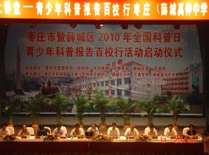9月13日,由枣庄市委宣传部、市科协、市科技局、市环保局,薛城区委、区政府共同举办的枣庄市2010年“全国科普日” 暨青少年科普报告百校行活动启动仪式在薛城区奚仲中学举行。市委常委、统战部长陈伟、中国科学院大气物理所研究院高登义出席了启动仪式,薛城区委书记岳德川同志致辞,市科协主席丁印泉同志主持启动仪式。奚仲中学600余名师生参加了启动仪式和现场科普活动。