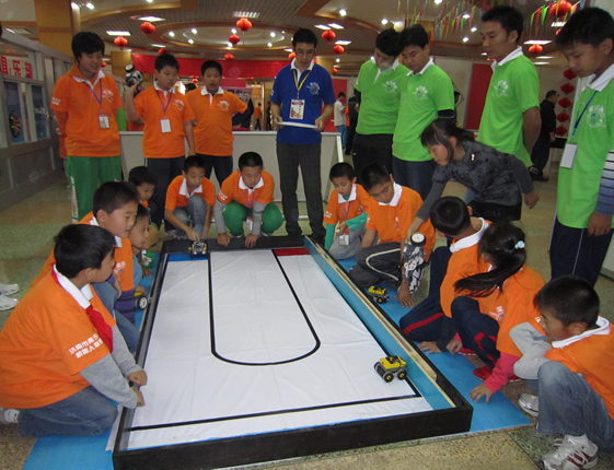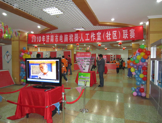 开幕式后,各位领导饶有兴趣的参观了率先展开“2010年济南市电脑机器人工作室(社区)联赛”。本次由市科技馆承办的机器人联赛共有来自全市32个机器人工作室的52支代表队、180名选手参加。本次比赛共设机器人轨迹比赛(折返跑项目)、智能投标比赛、足球射门、智能投篮比赛等项目,共决出一等奖30个、二等奖45个和三等奖68个。参赛规模创下历年机器人工作室联赛之最。本届机器人联赛采取市场化运作,共吸引4家赞助单位为本次比赛提供奖品,为青少年活动开辟了一个新的市场,让商家或企业都参与和关注青少年活动,使大赛有声有色创出我们自己的市场品牌。同时增进了青少年电脑机器人工作室之间的相互交流,促进了各工作室的科普工作。