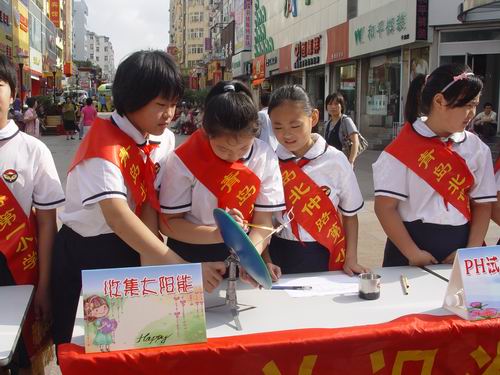 活动中的实验资源包是为配合全国青少年科学调查体验活动由专家们开发设计的与节约用纸和低碳生活相关的小实验。资源包由《实验活动指导手册》、活动所需要的实验器材组成。如“收集太阳能”实验中,就用到了太阳灶、水杯等用具。同学们在实验过程中,按照《指导手册》上的步骤调试好实验器材后,测量水的温度变化情况,在老师的辅导下利用公式计算出太阳灶共有效利用太阳能多少焦耳,并进一步思考《指导手册》上提出的问题。